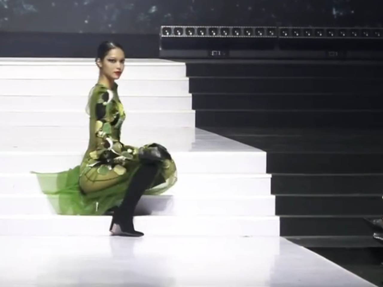 Модель появилась на шоу бренда Ha Linh Thu в полупрозрачном зеленом макси-платье и черных сапогах на каблуках. Она споткнулась и упала, когда спускалась по лестнице. Однако, вскоре она села на ступени, выпрямила спину, подтянула ногу и аккуратно поднялась на ноги.