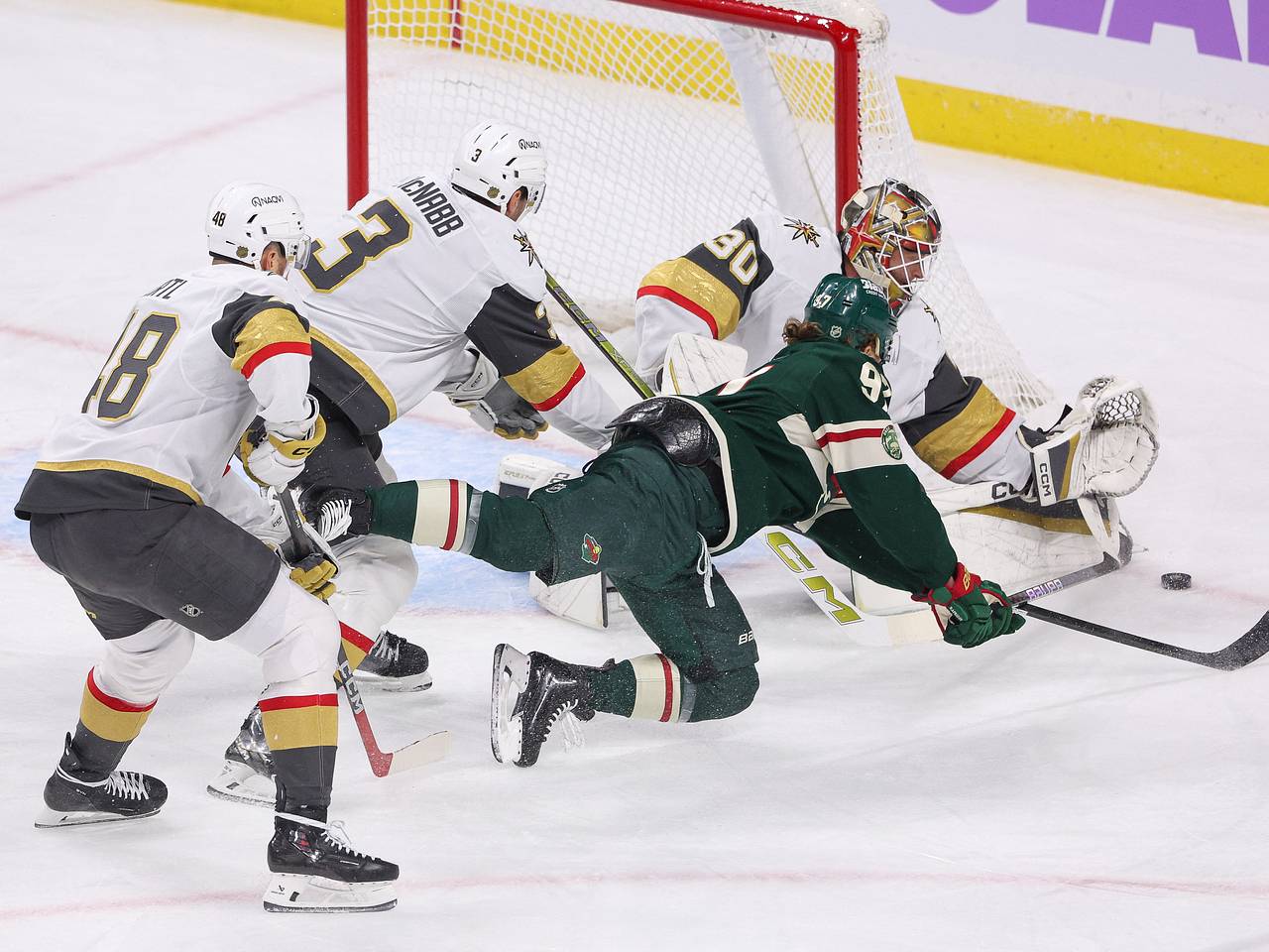Встреча состоялась в ночь на понедельник, 17 ноября, и завершилась со счетом 3:2 в пользу хозяев после овертайма. В составе победителей отличились россиянин Кирилл Капризов, а также Йоэль Эрикссон Эк. У «Вегаса» шайбы забили российский нападающий Павел Дорофеев и Райлли Смит.