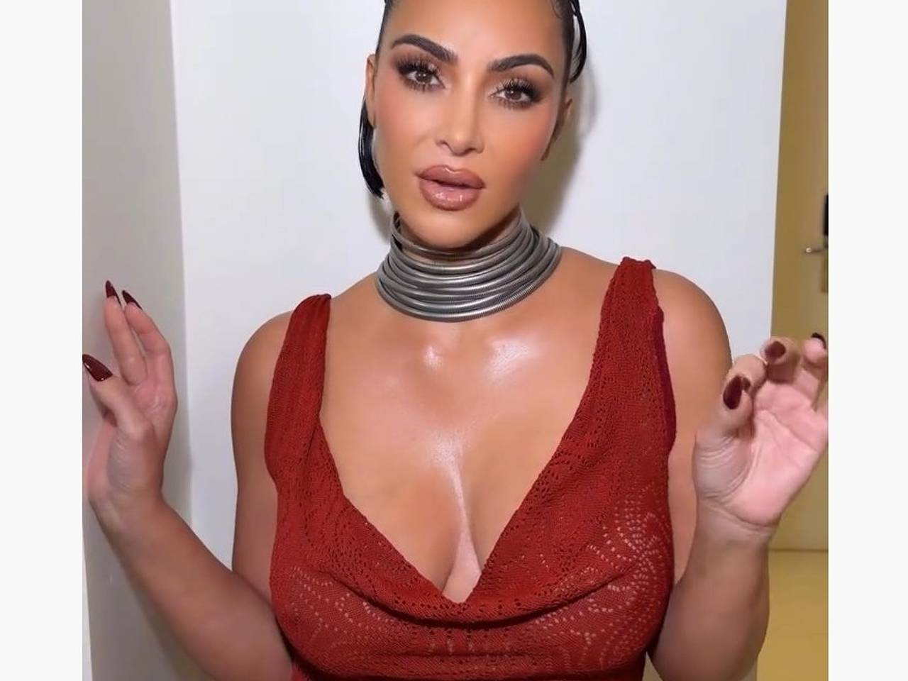 Кардашьян также собрала волосы в аккуратную прическу и сделала нюдовый макияж, который дополнила многослойным серым ожерельем.