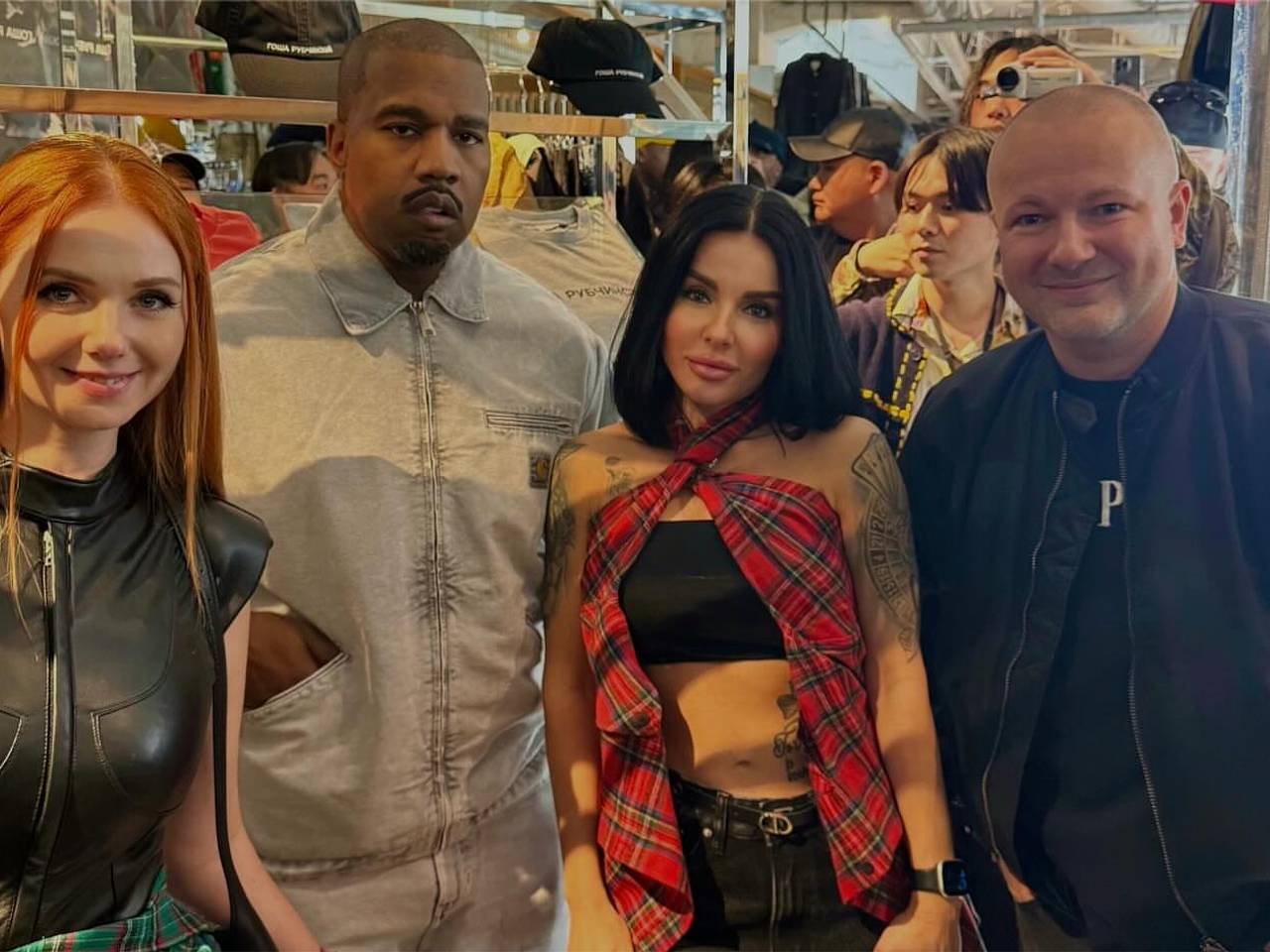 На опубликованном фото 40-летняя певица позирует рядом с Канье Уэстом, дизайнером Гошей Рубчинским и своей коллегой по группе Еленой Катиной. Она выбрала для съемки джинсы и черный кроп-топ, поверх которого надела клетчатый топ черно-красного цвета, открывающий плечи и живот.