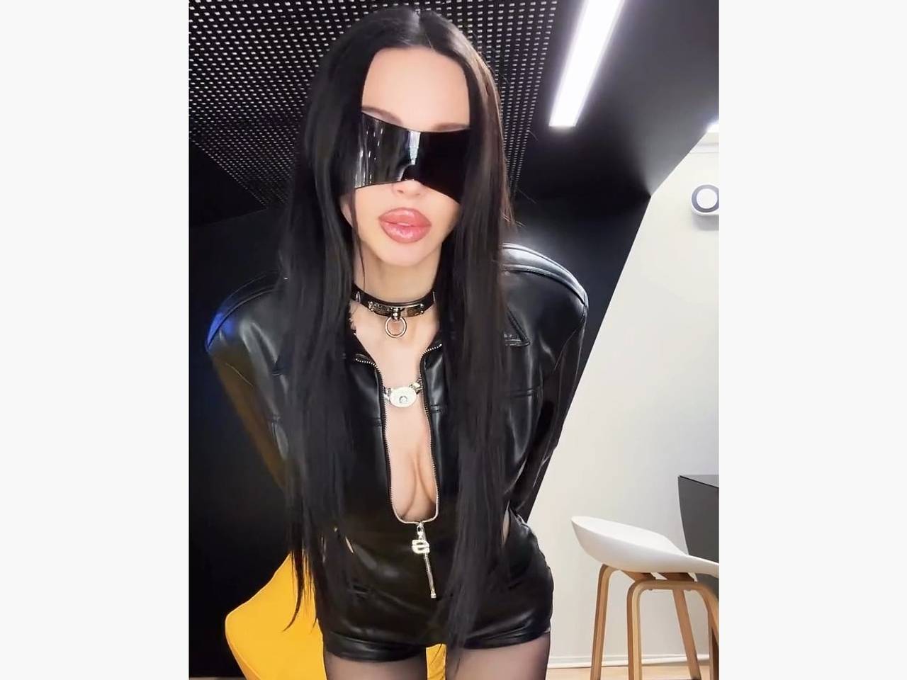 37-летняя инфлюэнсерша предстала в черных кожаных микрошортах, расстегнув куртку, которую надела на голое тело, и наклонившись, показала часть обнаженной груди.