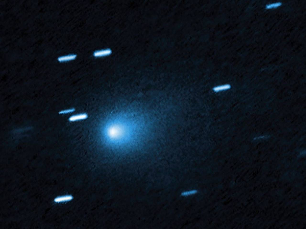Это изображение было получено с помощью космического телескопа «Хаббл» 21 июля текущего года, когда комета находилась на расстоянии 445 миллионов километров от нашей планеты. Ученые отмечают, что на фотографии также видны полосы неподвижных фоновых звезд, так как телескоп следил за кометой в ее движении по гиперболической траектории.