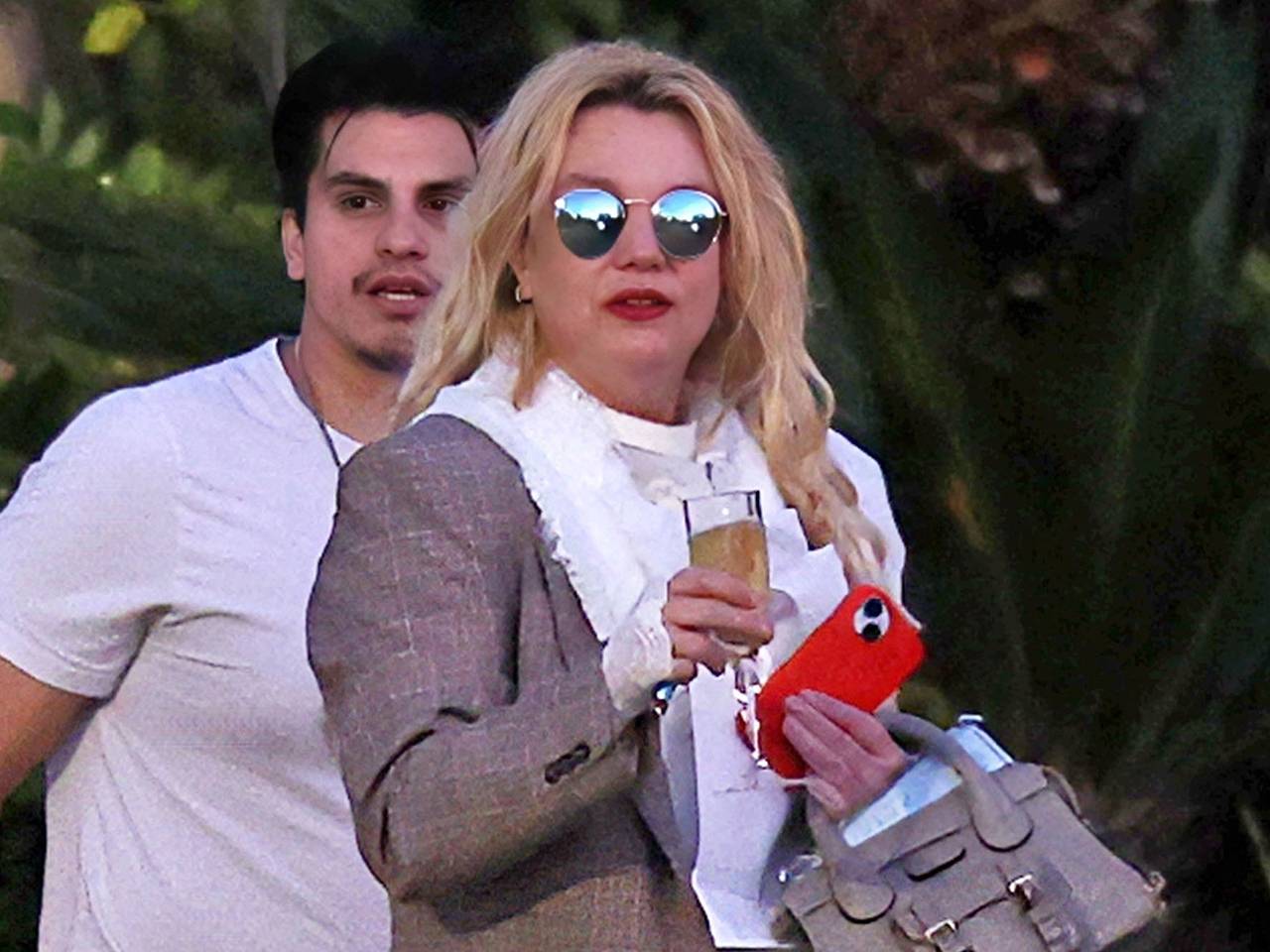 43-летняя артистка была замечена, когда выходила из бара Stonehaus, держа в руке бокал с шампанским. На ней были темно-синие джинсы с низкой посадкой, белая укороченная блуза с рюшами и серый клетчатый пиджак. Также на Бритни были солнцезащитные очки.