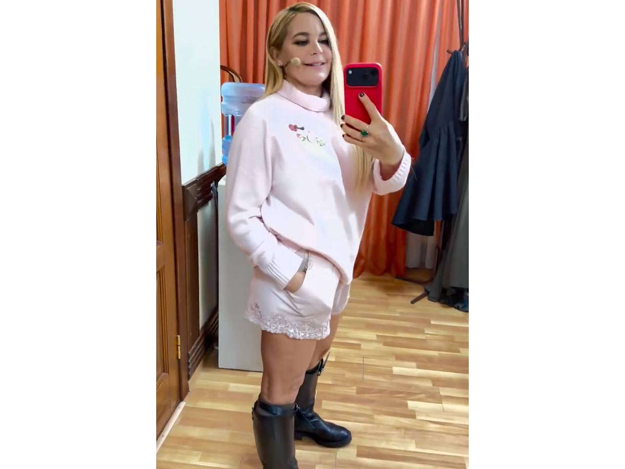 47-летняя звезда сериала «Зять» запечатлела себя на видео, позируя в светло-розовом свитере и шелковых кружевных шортах, дополненных черными сапогами с высоким голенищем.