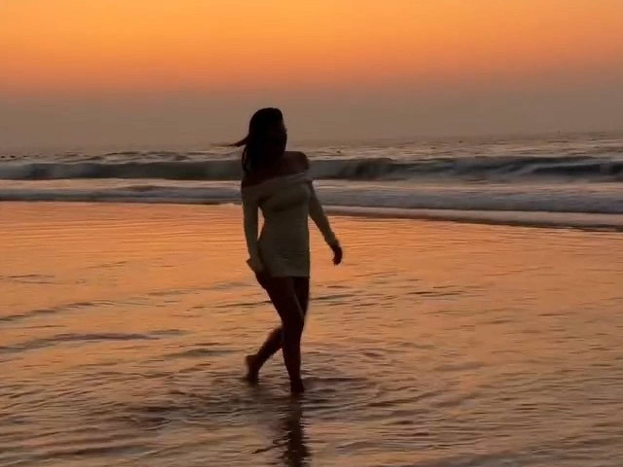 40-летняя артистка весело пробежалась по воде в белом мини-платье с открытыми плечами, подчеркивающем ее фигуру. Также она распустила длинные темные волосы, позируя на фоне заката.