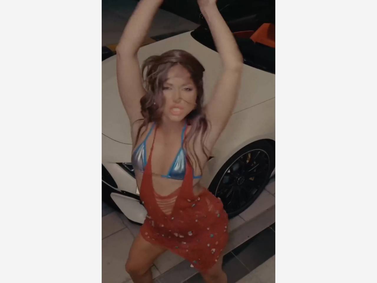 35-летняя артистка предстала в крошечном голубом бюстгальтере и красном платье, которое подчеркивало её фигуру.