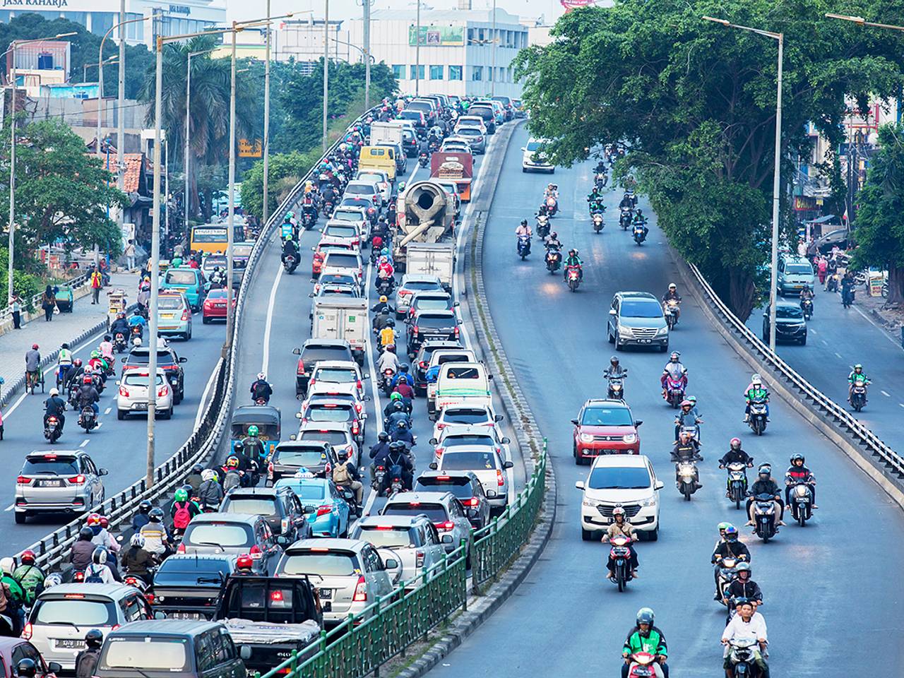 Машин в Джакарте огромное количество, из-за чего короткая поездка может затянуться на час. Местные жители привыкли выходить из дома за два часа до начала рабочего дня.