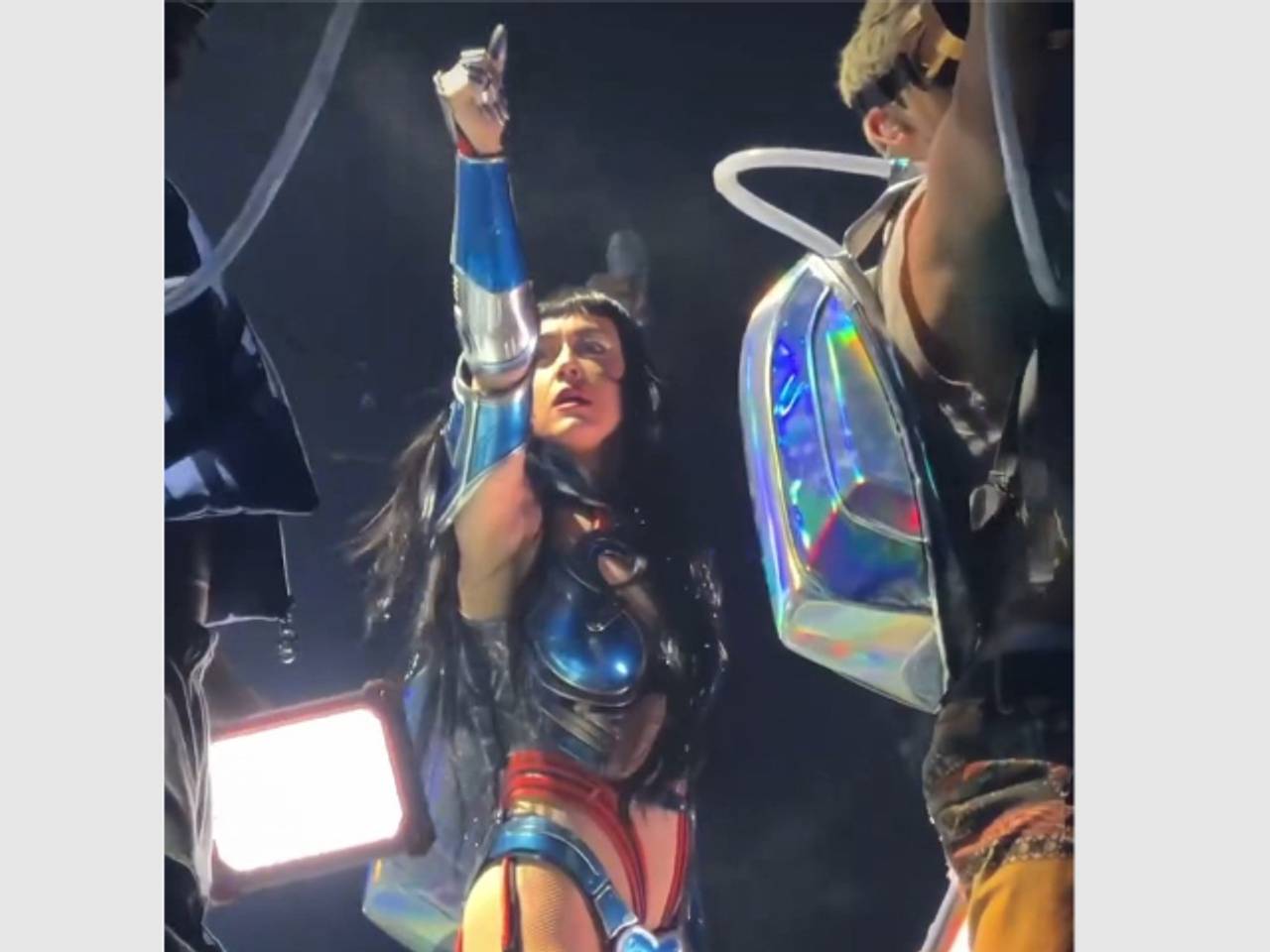 41-летняя звезда появилась перед зрителями в костюме, который имитировал доспехи. Этот наряд состоял из облегающего боди, соединенного с обувью и нарукавниками.