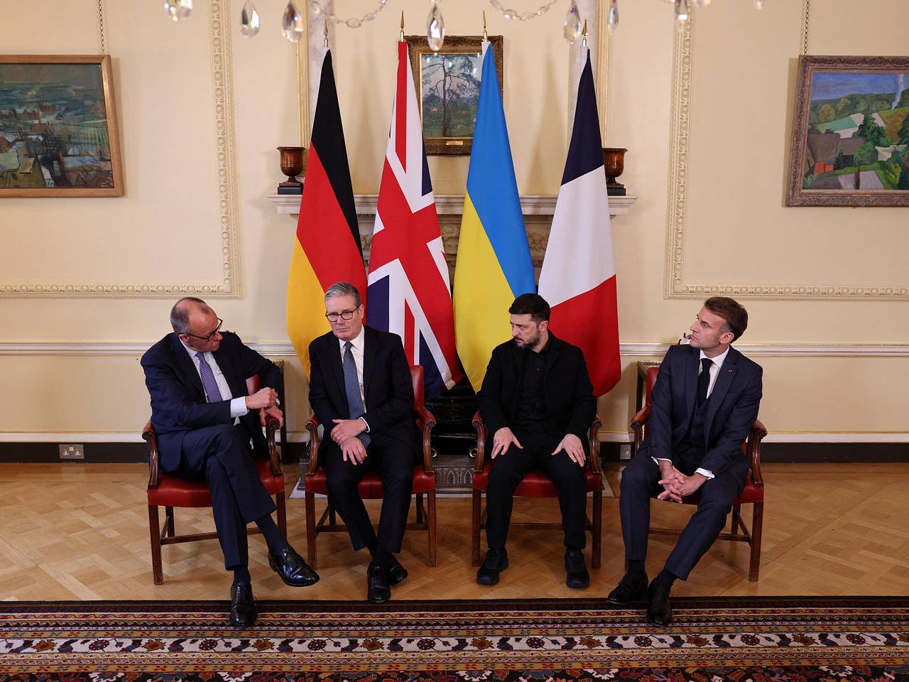 По итогам переговоров премьер-министр Великобритании Кир Стармер, президент Франции Эммануэль Макрон, канцлер Германии Фридрих Мерц и Зеленский отметили важность достижения справедливого и устойчивого мира для Украины, который будет включать надежные гарантии безопасности и использование замороженных российских активов в качестве кредита для Киева.