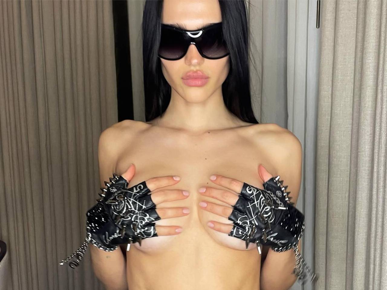 Американская модель Амелия Грей Хэмлин опубликовала откровенное изображение на своей странице в социальной сети. Дочь известной телеведущей Лизы Ринны и актера Гарри Хэмлина позировала с обнаженной грудью, прикрытой руками в кожаных перчатках с заклепками и цепями.