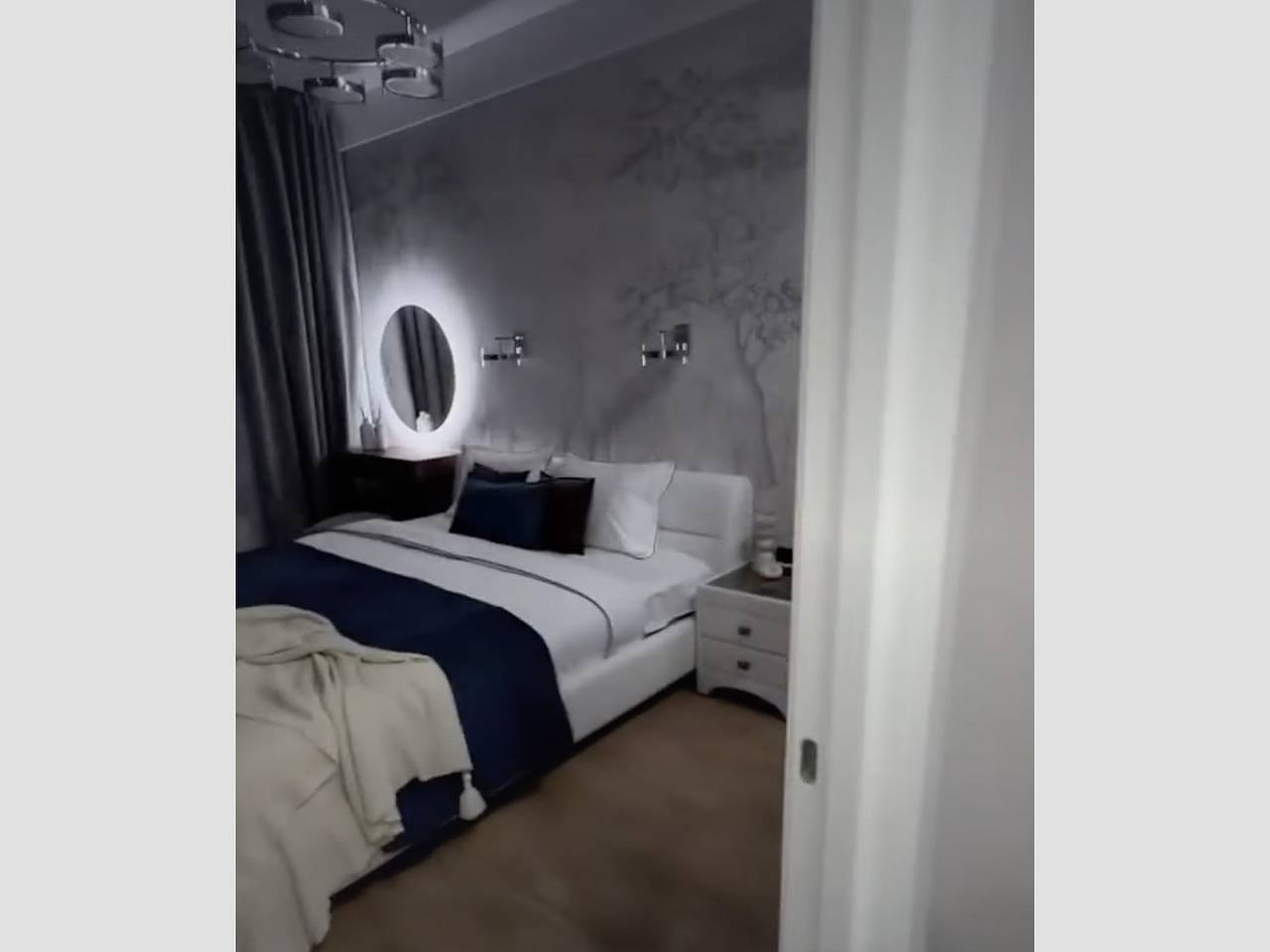 На фотографиях из квартиры видно, что интерьер выполнен в спокойных бело-бежевых тонах с синими и черными акцентами.