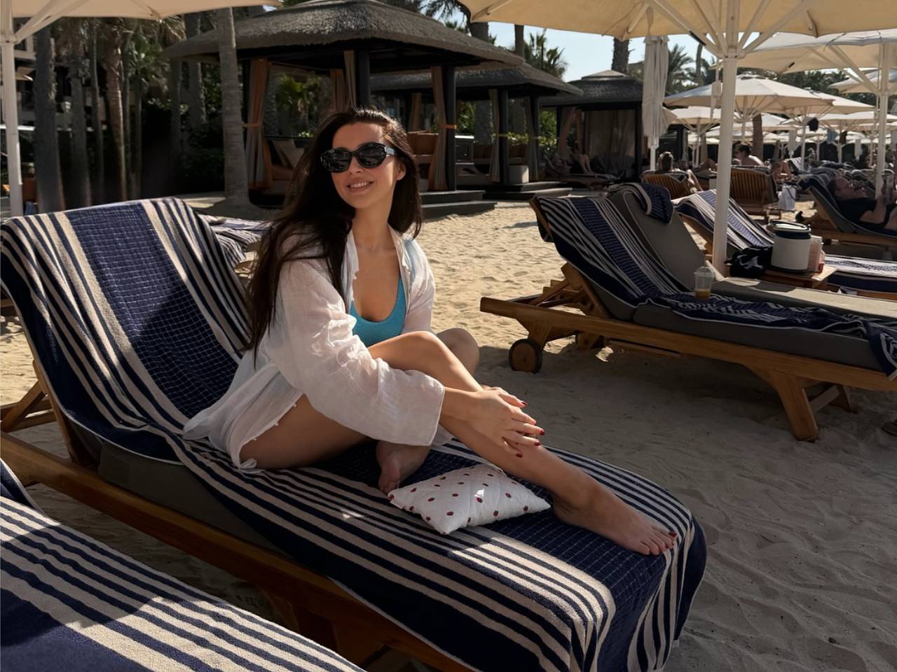 29-летняя блогерша позировала в голубом слитном купальнике и полупрозрачной белой рубашке, сидя в шезлонге на пляже.